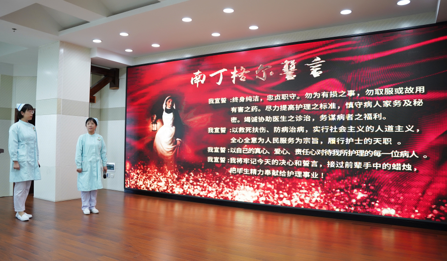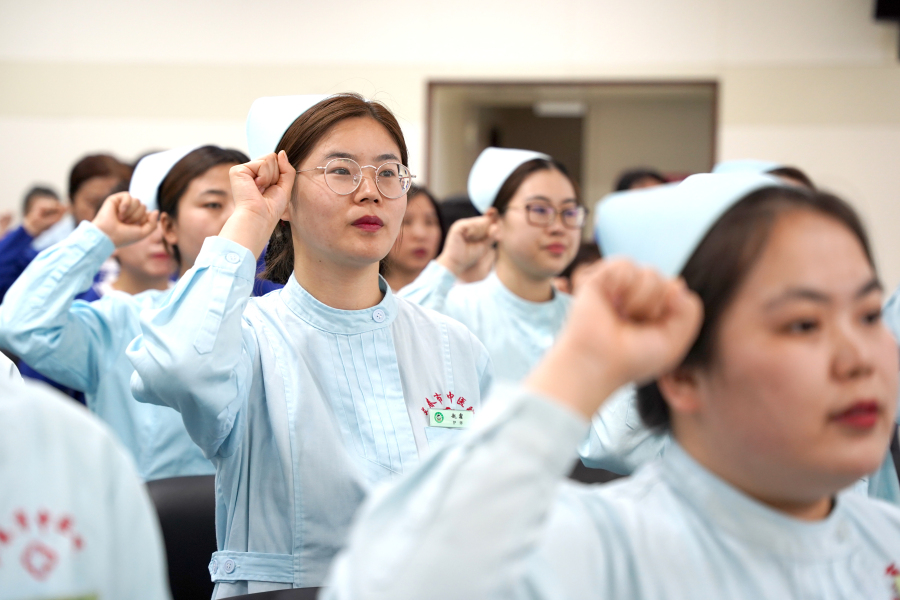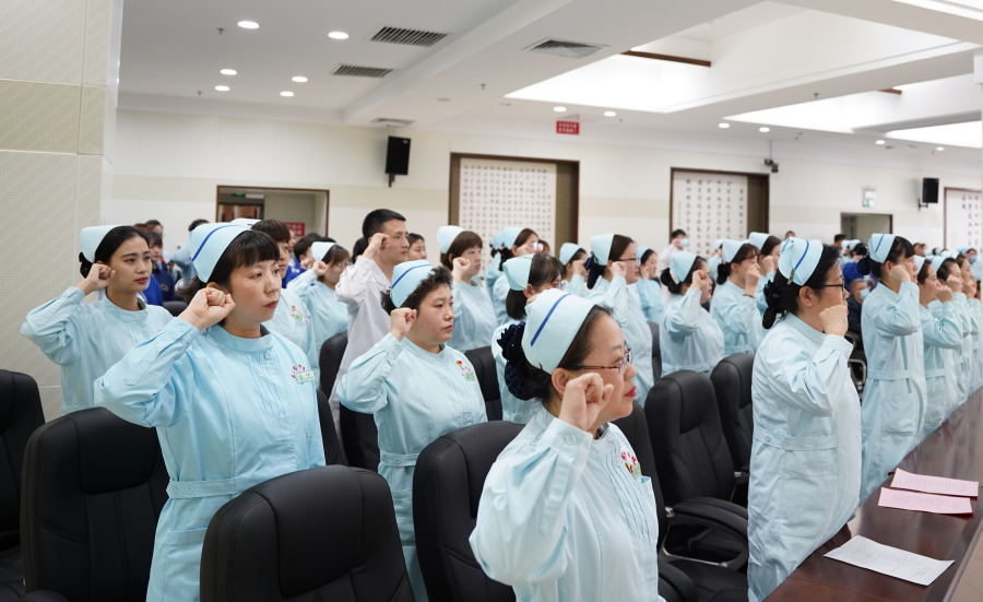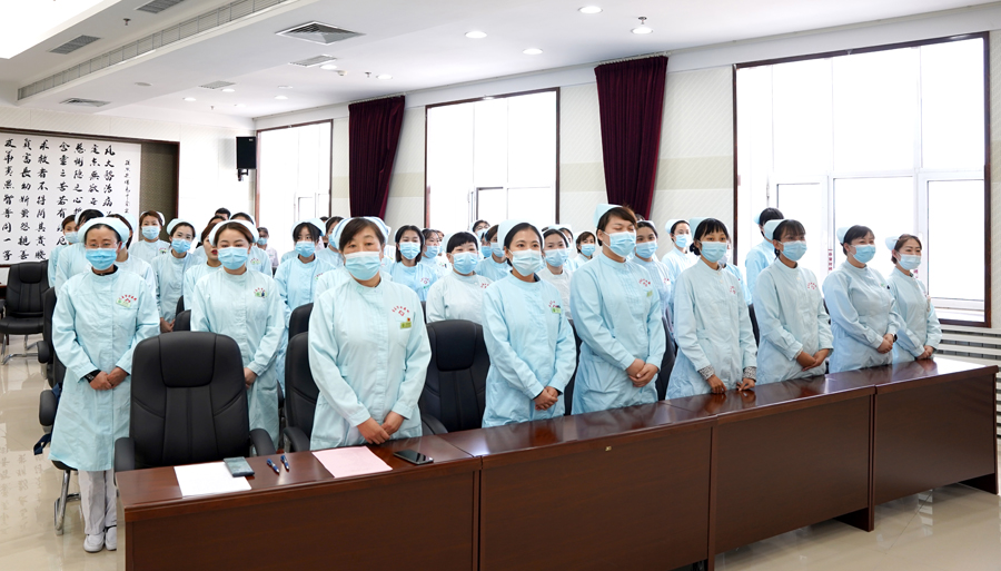 “我宣誓终身纯洁,忠贞职守”“我宣誓以救死扶伤、防病治病,实行社会主义的人道主义”……全体护士在南丁格尔图像前,高举右拳,重温南丁格尔誓言,感悟新时代护理工作者的初心和使命。