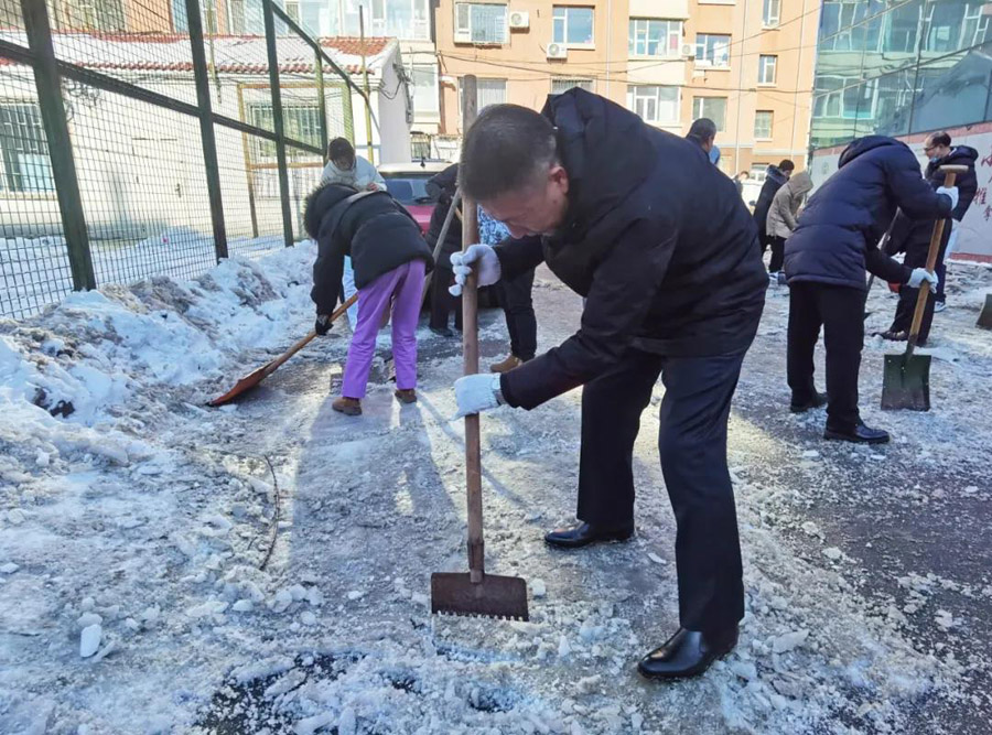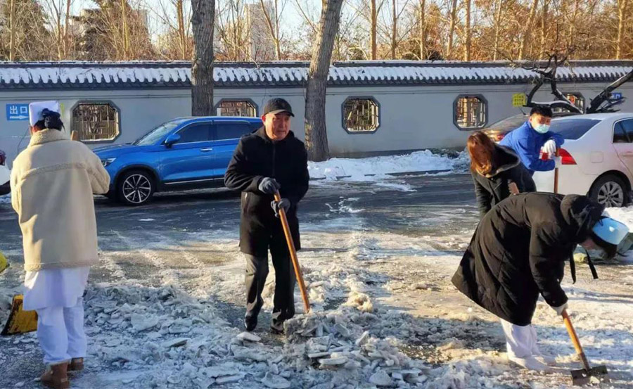 平阳部和东部党员干部和后勤职工执行“破冰”任务——清理院内残余冰雪。
