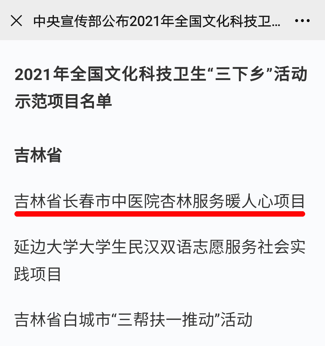 近日,中央宣传部公布2021年全国文化科技卫生“三下乡”活动示范项目、优秀团队、服务标兵名单。吉林省德州扑克平台网 杏林服务暖人心项目获得2021年全国文化科技卫生“三下乡”活动示范项目;吉林省德州扑克平台网 主任医师赵继福获得2021年全国文化科技卫生“三下乡”活动服务标兵称号!