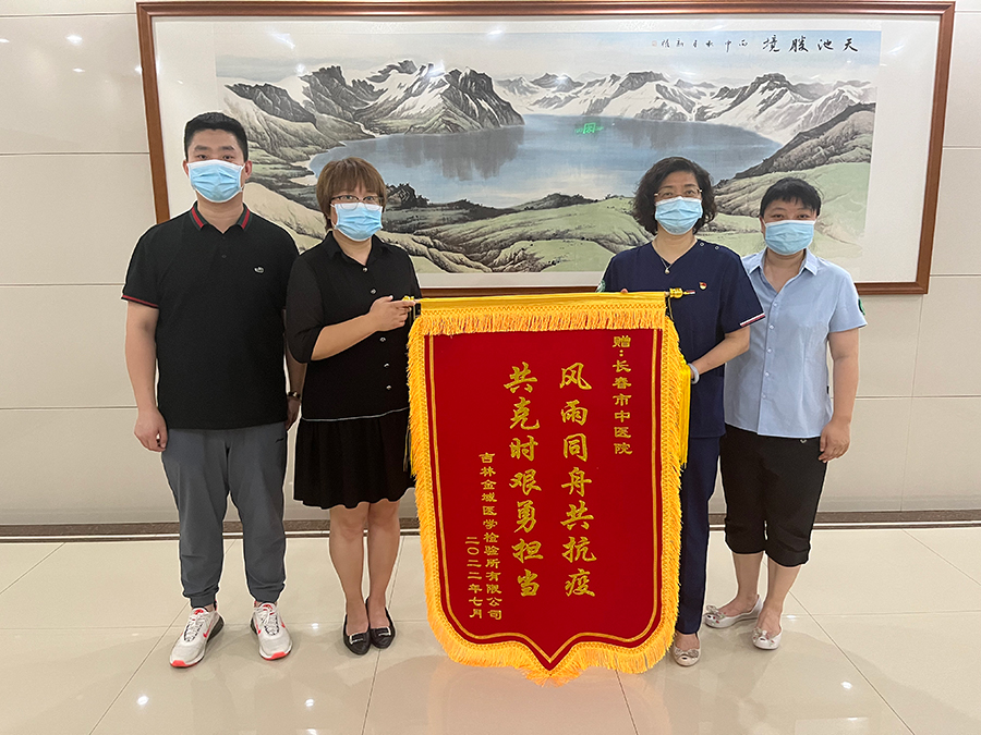 8月3日,吉林金域医学检验所有限公司副总经理李雨艳和人力资源部经理王海龙将锦旗送到了德州扑克平台网 党委副书记周艳、检验科副主任崔久龙和工作人员辛嘉琪的手中,感谢德州扑克平台 在战“疫”中与金域检验公司风雨同舟、共克时艰;感谢检验科工作人员辛嘉琪在抗疫工作中的勇于担当和无私奉献。