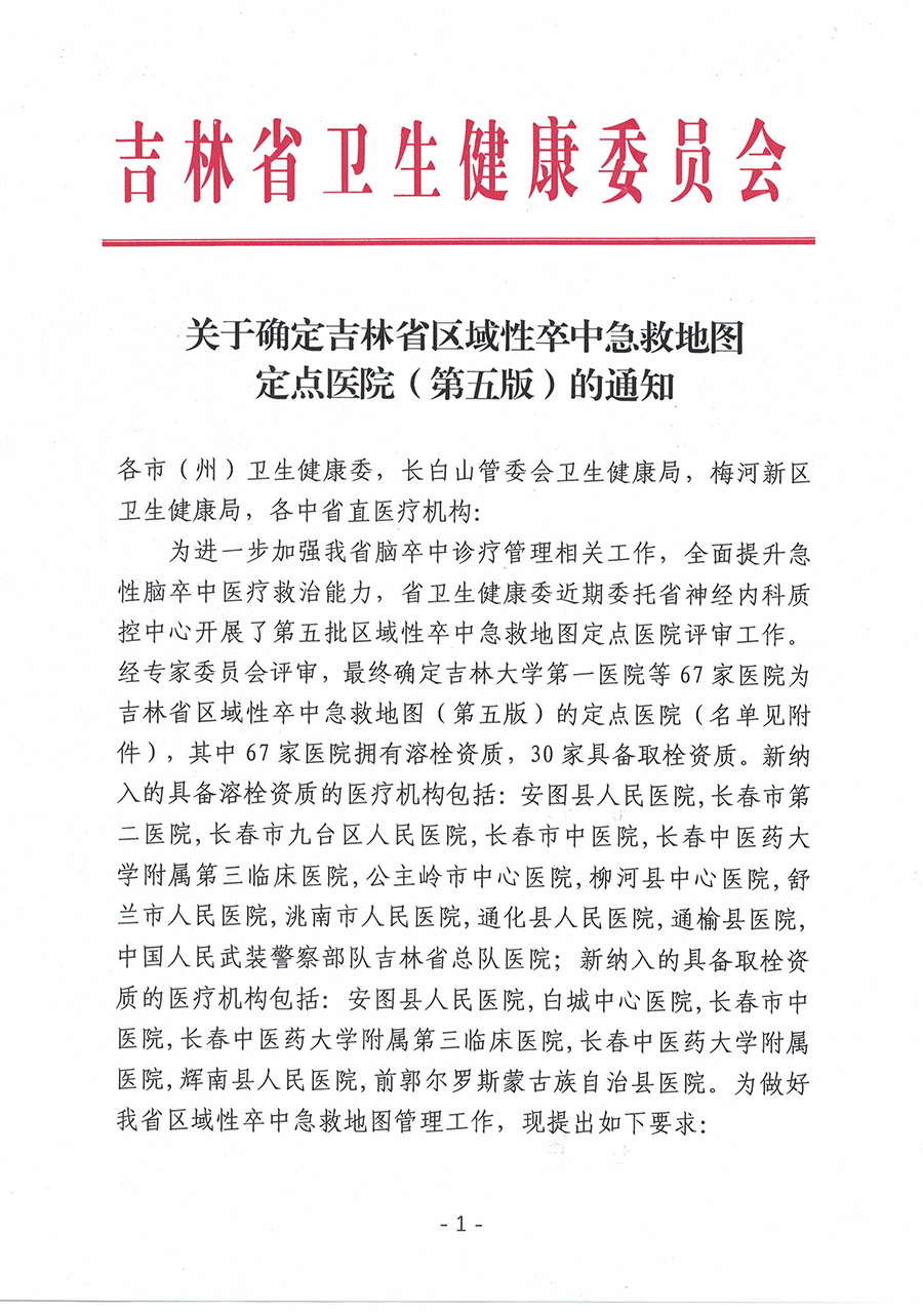 为进一步加强吉林省脑卒中诊疗管理相关工作,全面提升急性脑卒中医疗救治能力,省卫生健康委近期委托省神经内科质控中心开展了第五批区域性卒中急救地图定点德州扑克平台 评审工作。经专家委员会评审,拥有溶栓、取栓资质的德州扑克平台网 ,获批成为“吉林省长春市卒中急救地图定点德州扑克平台 ”(第五版)。