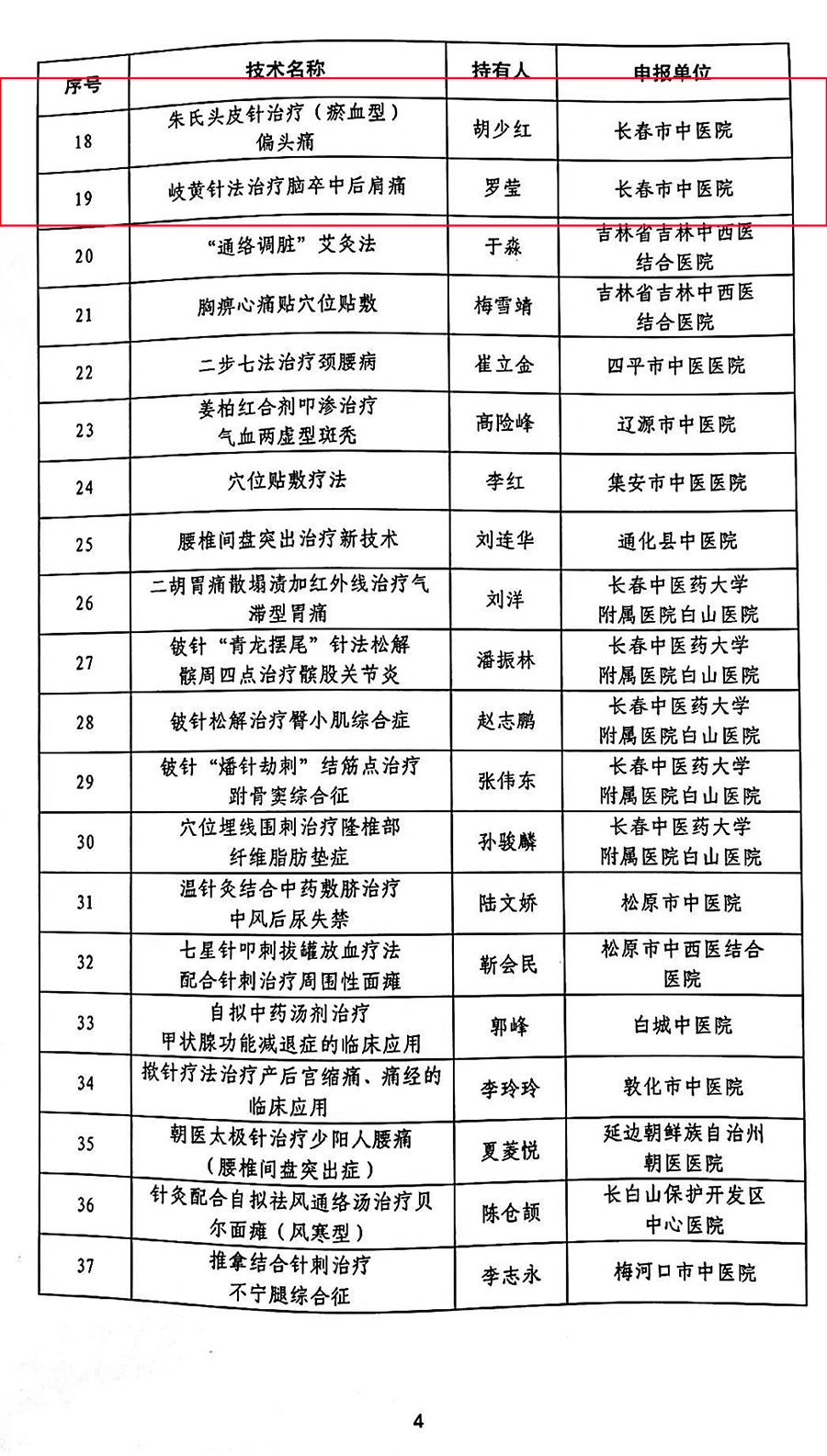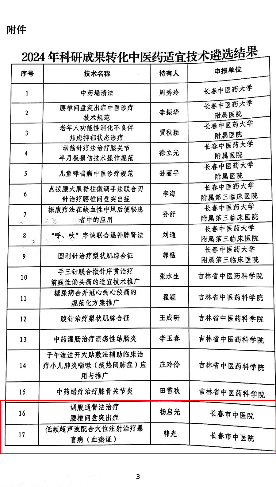 为进一步贯彻落实《吉林省中医药发展“十四五”规划》,促进优秀研究成果转化应用,提升临床服务能力和疗效评价能力,吉林省中医药管理局对近五年结题验收的中医药科技项目成果进行梳理,并于2024年4月启动了中医药适宜技术遴选工作。经技术持有人申报、项目单位推荐,省中医药管理局确定37项中医药适宜技术纳入全省推广范围。德州扑克平台网 共有4项适宜技术入选其中,①杨启光《调腹通督法治疗腰椎间盘突出症》,②韩光《低频超声波配合穴位注射治疗暴盲病(血瘀证),③胡少红《朱氏头皮针治疗(瘀血型)偏头痛》,④罗莹《岐黄针法治疗脑卒中后肩痛》。