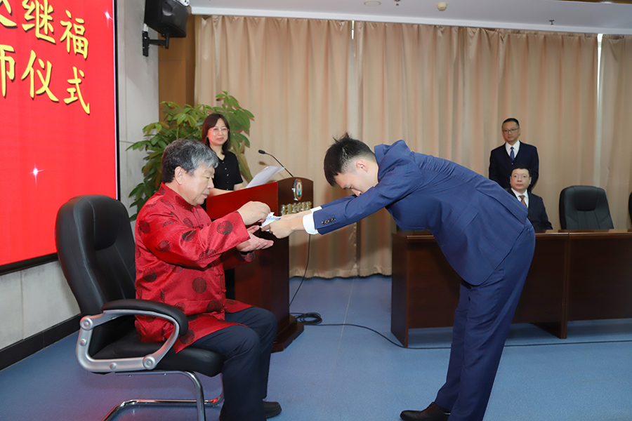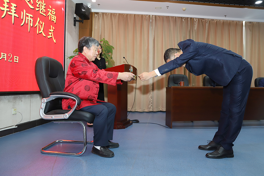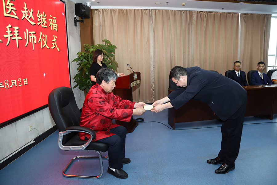“弟子李晓,久慕赵继福先生,欲拜师门下,请先生不辞……”拜师仪式上,李晓、韩冰、袁鹏3位中医药领域的青年才俊身着正装,依次上前,恭敬地为赵继福教授呈上拜师帖,再与赵继福教授签订协议正式确立师徒关系后,敬上香茶。随后,学员们还呈上了精心准备的“六礼”和鲜花,以表达自己对中医的热爱与传承。