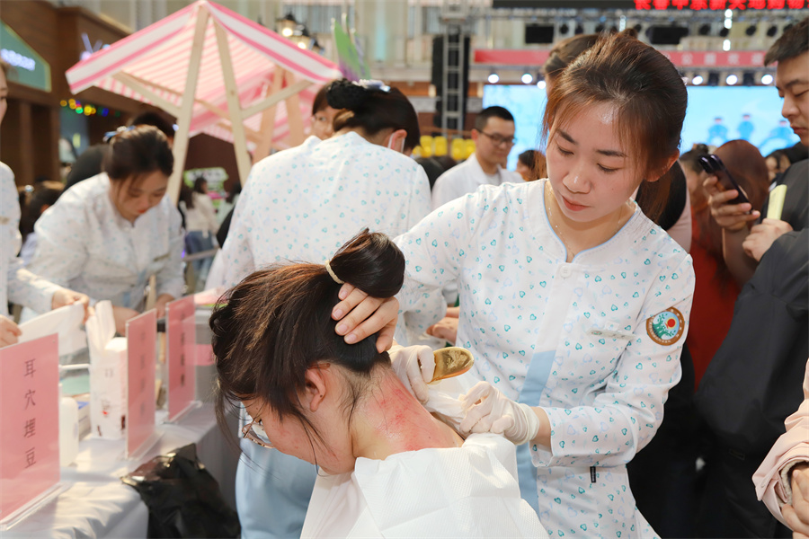 中医药特色疗法体验区无疑成为了市民们争相“打卡”的热门之选。刮痧、拔罐、砭石温灸、揿针、头针、耳穴埋豆……每一项都吸引着市民朋友排队解锁。三天时间里,超3000人参与体验。大家纷纷赞叹这些特色疗法让他们“血脉觉醒”,彻底对中医“着迷”了。