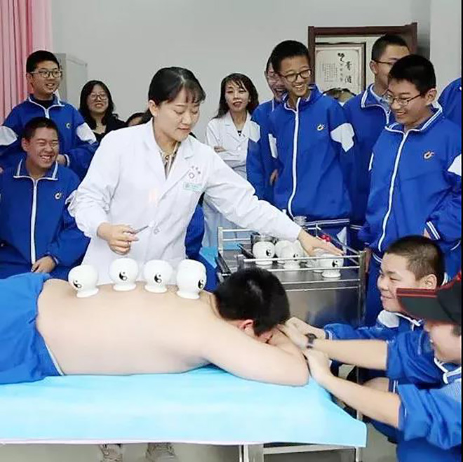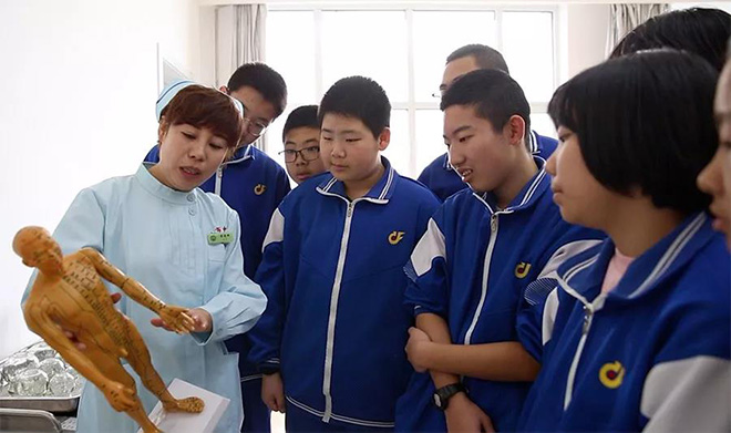 位于4楼的治未病中心,古典雅致,窗明几净,空气中飘着淡淡的中药气息。情志测评、体质辨识、经络分析、健康干预、特色疗法,合理的布局,完善的设施,可为中小学生的健康状况提供全面的诊断、精准评估。大家还还可以,练一练,将传统文化与健康意识相结合的“晨练三部曲”;品一品,针对人体九种中医体质的不同特点研制的养生药茶;听一听,调达全身气机,安抚失衡的五脏的“五行音乐疗法”;体验一把推拿、针刺、刮痧、拔罐等中医传统方法,达到“身心俱健”的良好状态。