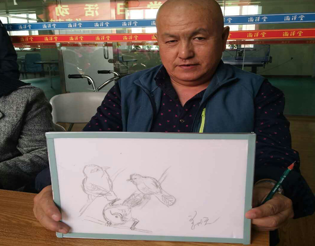 养老中心的小课堂里座无虚席,还有好几个“学生”都坐到了课桌旁边,把画板垫在腿上绘画。此次陈立春授课的内容是画小鸟,他拿出了一张事先准备好的小鸟图,老人们见了纷纷窃窃私语,“这太难了吧,咱们能画出来吗?”