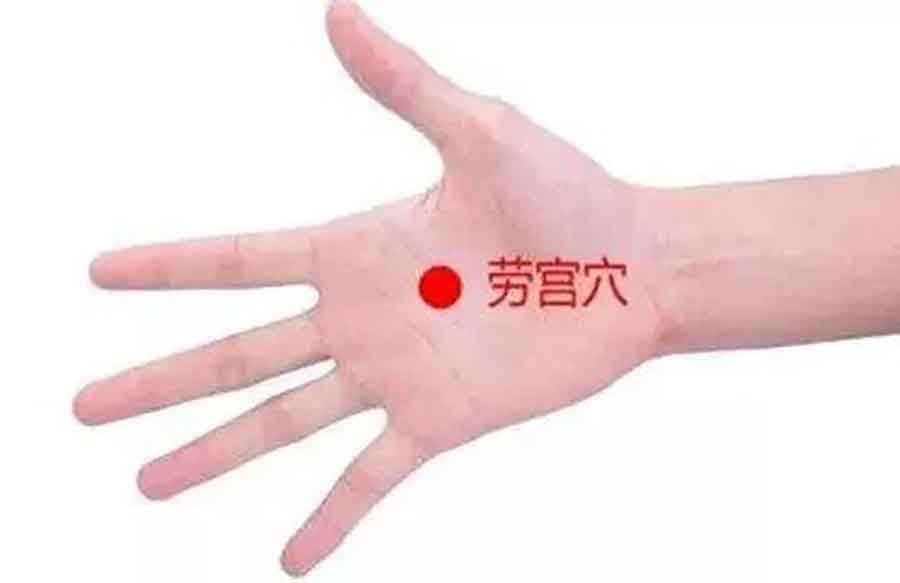 劳宫穴定位:在手掌心,当第2、3掌骨之间偏于第3掌骨,握拳屈指时中指尖处。