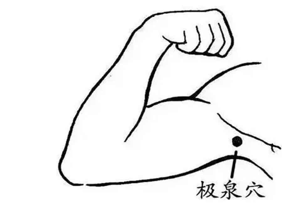 极泉穴定位:上臂外展,在腋窝顶点,腋动脉搏动处。
