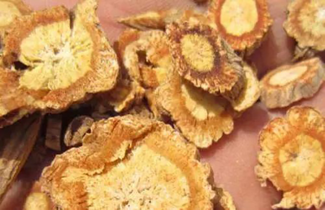 为圆形或椭圆形厚片。切面黄白色或浅黄色。木部圆形,黄色, 具放射状纹理,有的可见小型髓部;形成层环色深;皮部棕黄色至棕色, 有多数放射状裂隙及多数细小油点。质松软。气特异,味微甘。