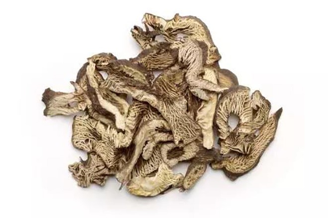 性状鉴别:为不规则的长形块状,多分枝,呈结节状,长10~20cm,直径2~4cm。表面黑褐色或棕褐色,粗糙不平,有坚硬的细须根残留,上面有数个圆形空洞的茎基痕,洞内壁显网状沟纹;下面凹凸不平,具须根痕。体轻,质坚硬,不易折断,断面不平坦,有裂隙,纤维性,黄绿色或淡黄白色。气微,味微苦而涩。