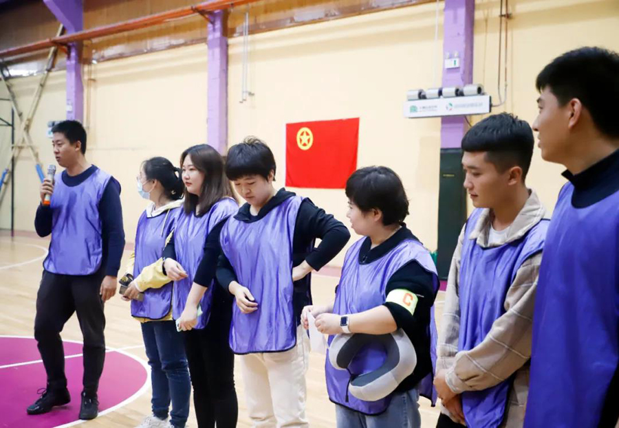 游戏“运球接力”:游戏中,女队员们也很不甘示弱,她们有节奏地带球跑,让男队员们也很惊讶,“加油!加油!就差最后一人了。”双方你来我往,节奏感超强。