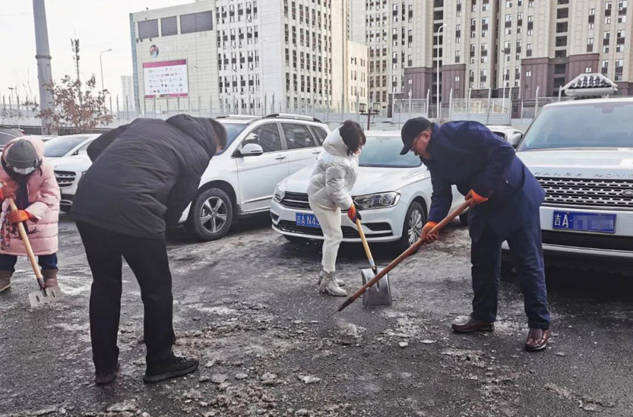 平阳部和东部党员干部和后勤职工执行“破冰”任务——清理院内残余冰雪。