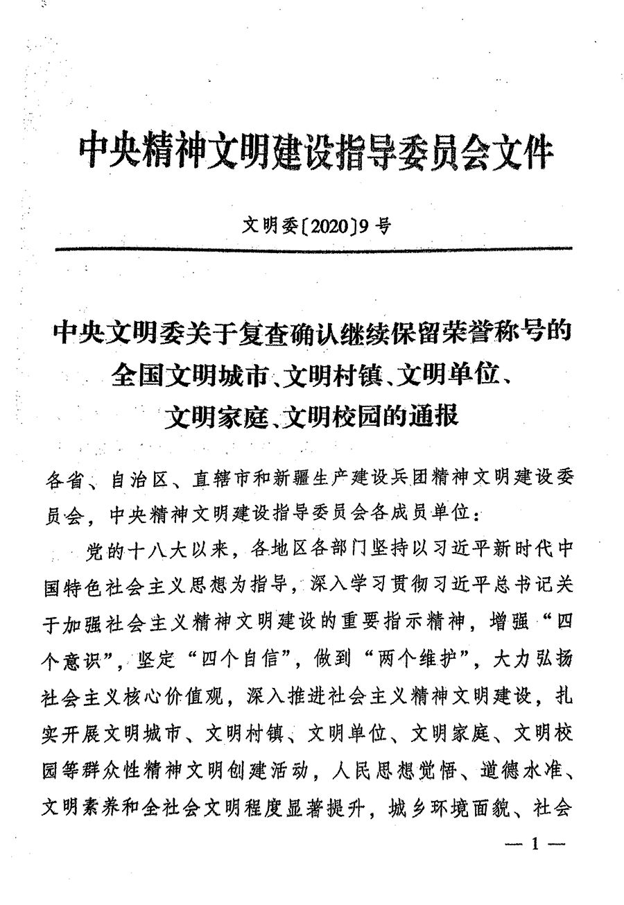 为大力弘扬社会主义核心价值观,深入推进社会主义精神文明建设,根据《中央文明委关于复查确认继续保留荣誉称号的全国文明城市、文明村镇、文明单位、文明家庭、文明校园的通报》(文明委〔2020〕9号)文件精神,德州扑克平台网 以优异成绩顺利通过,成功保留全国文明单位荣誉称号。德州扑克平台网 被评为全国文明单位以来,注重思想引领,积淀德州扑克平台 文化,勇于承担社会责任,塑造和弘扬伟大抗疫精神。
