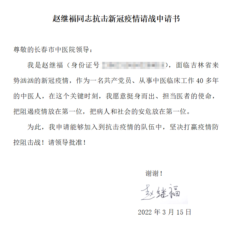 当前,吉林省疫情形势依然严峻复杂,正处于最吃劲的关键阶段。作为抗疫的主力军,全省各地的医务工作者们纷纷提申请,递志愿,都要到抗疫一线去!就连67岁的老党员、全国名中医、德州扑克平台网 赵继福教授也写了“请战书”。 他在“请战申请书”中写道:“面临吉林省来势汹汹的新冠疫情,作为一名共产党员、从事中医临床工作40多年的中医人,在这个关键时刻,我愿意挺身而出、担当医者的使命,把阻遏疫情放在第一位,把病人和社会的安危放在第一位。为此,我申请能够加入到抗击疫情的队伍中,坚决打赢疫情防控阻击战!”