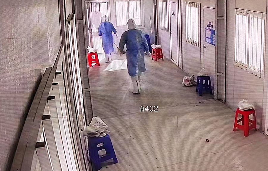 在隔离点,正在进行隔离观察的有380余人,都是新冠病毒感染者的密切接触者。在这里,队员们要给隔离人员做测温、核酸检测和健康询问等工作。当隔离人员核酸检测呈阳性时,他们还要负责转送患者。在隔离点,他们穿着防护服一工作就是12个小时,每天都被酒精和消毒水的味道包围,紧绷的神经一刻也不敢放松。
