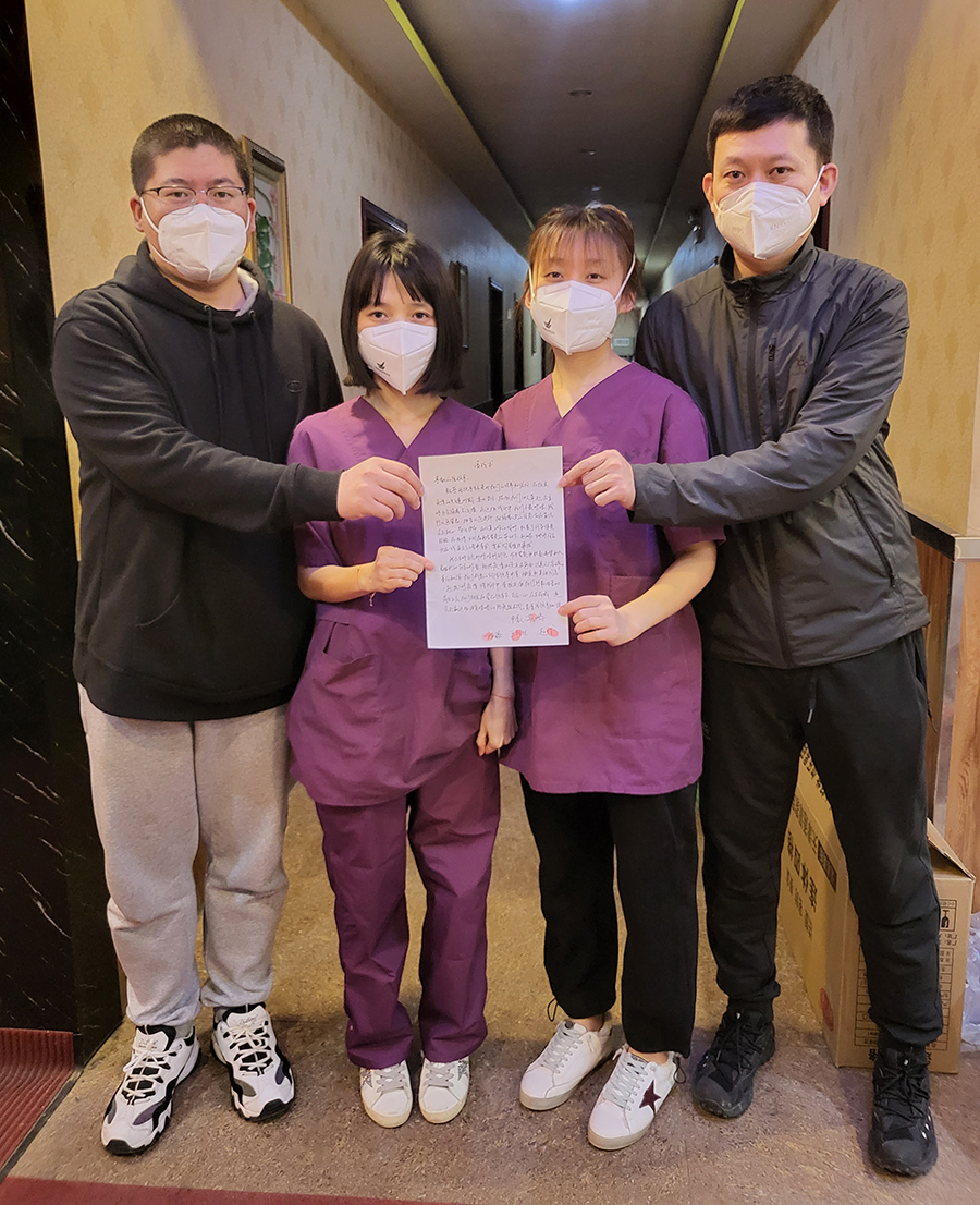 即将完成支援公主岭方舱隔离点 的工作,赵博、赵鹏、王致磊、王玲玲4人了解到德州扑克平台网 又将支援一家方舱德州扑克平台 ,他们没有片刻犹豫,立刻手写请战书,请求前去支援,加入下一场“战斗”。
