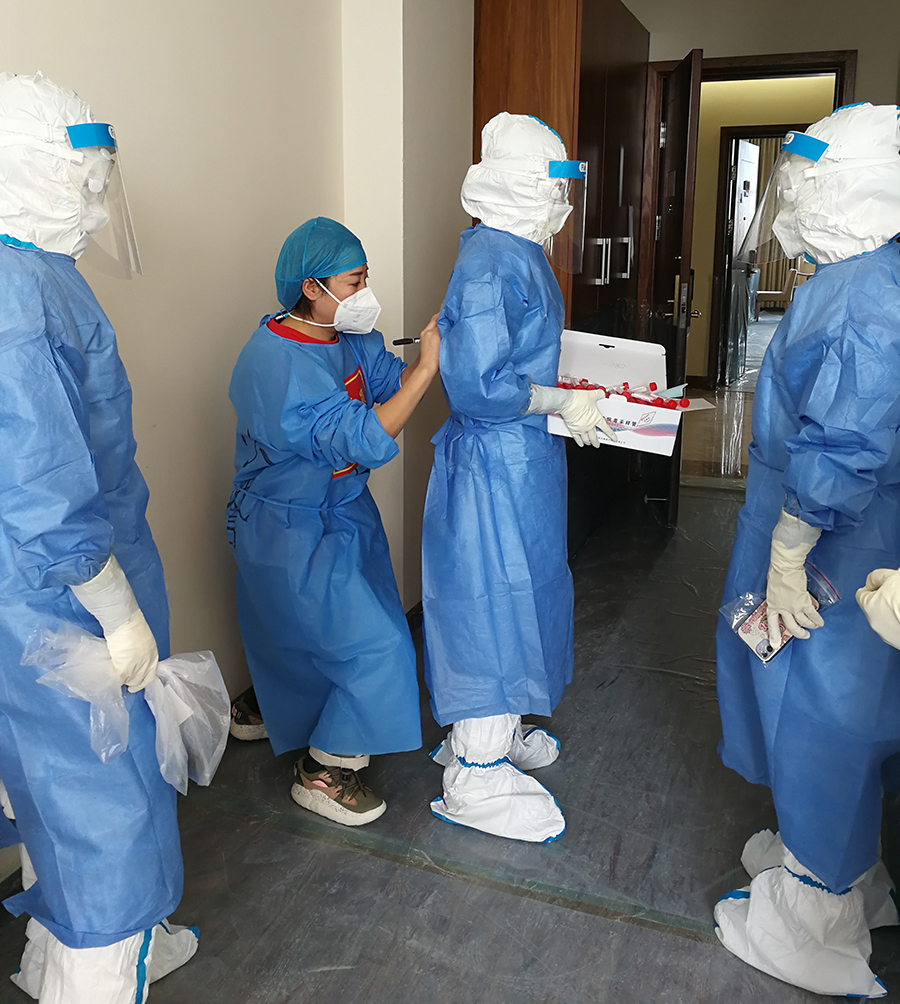 她成了队员眼中的“拼命三郎”,每次有新接收人员入住,訾英辉首先要详细登记信息,告诉他们场所消毒隔离的要求及个人防护需知,第一时间掌握观察人员情况。她每天都会对隔离人员进行询问,送上关怀,保障日常生活所需,每天重复同样的步骤,繁琐而严谨。在这里,她不仅是医护人员,有时是外卖员、有时是搬运工、有时是保洁员、有时是话务员,身兼数职。她总是在第一时间帮助隔离人员解决实际问题。为了给大家配送物资、解决问题,加上平时回收垃圾、场所消毒等本职工作,有时候一天下来,已数不清要跑多少趟,忙到连吃饭的时间都没有。