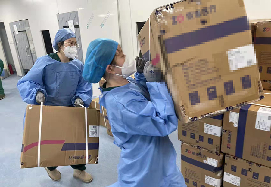 后勤保障组一半是女同志,每次有新物资运到时,因卸货地点距离物资库较远,卸货、搬运便是最大难题,但在王伟越的带领下,在后勤保障组管理员王美晶的配合下,女同事们更是巾帼不让须眉。有时货物来得晚,所有成员齐上阵,女同事搬小件,男同事扛大件。如果用上平板车,男同志便把牵引绳捆在腰上,其余的人有的拉绳子、有的推车。为了确保顺利入库,一干就是几个小时,常常奋战到凌晨。这就是中医人一贯的干劲,关键时刻他们从不缺席,勇当先锋,敢打头阵,甘于奉献。