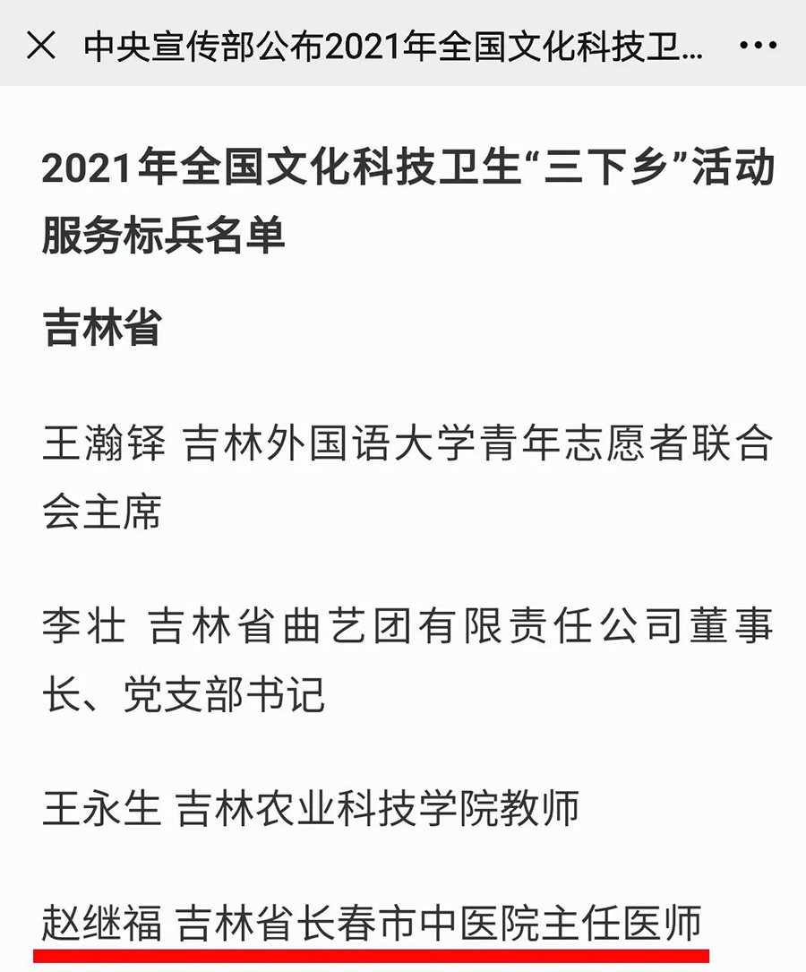 赵继福就是这样的大医。他是吉林省名中医、长春中医药大学及北京中医药大学特聘专家。1977年毕业于吉林医科大学中医系,是第五、六、七批全国老中医药专家学术经验继承工作指导老师。2009年被评为“吉林省劳动模范”;2010年被评为“全国医药卫生系统先进个人”;2021年被评为全国文化科技卫生‘三下乡’活动服务标兵”。