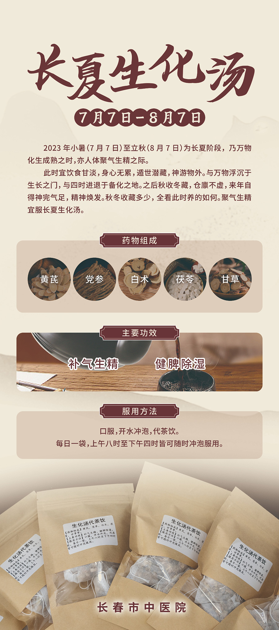 长夏生化汤以黄芪、党参、白术、茯苓、甘草等中药组成。每日取一小袋,以开水冲泡,代茶饮,于上午八时至下午四时饮用。服后如无不适可一直服到立秋,如感觉不适及时停用。每包可服用3天,到德州扑克平台网 任意门诊、科室医生处开方均可购买。