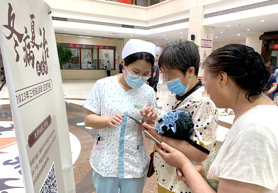 启动仪式结束后,慕名参加活动患者和群众纷纷拿出手机,在护士的协助下扫描活动二维码,经工作人员登记后,可以获取免费贴敷三伏贴的资格。医生和护士现场为大家贴敷,并讲解三伏贴的功效和注意事项等内容。