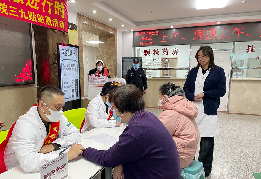 “三九贴”贴敷活动在总部、平阳部、东部同时启动。副院长杨启光、钱锐、曹亚丽分别与分管院部的医护人员一起为市民们提供健康服务,近距离体验中医特色。