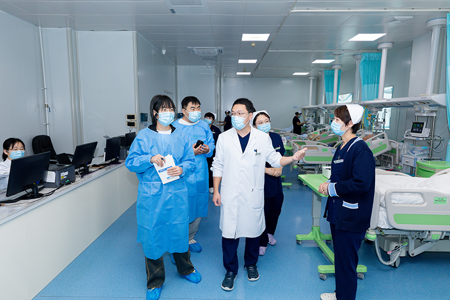 在重症医学科,一行人跟随潘英伟主任的步伐,了解科室的建设布局,就救治细节进行探讨。