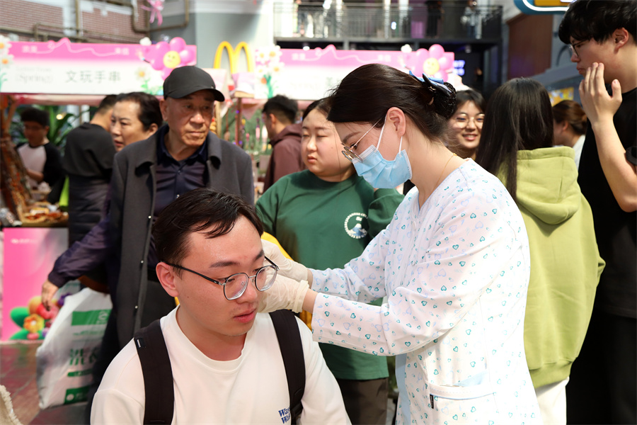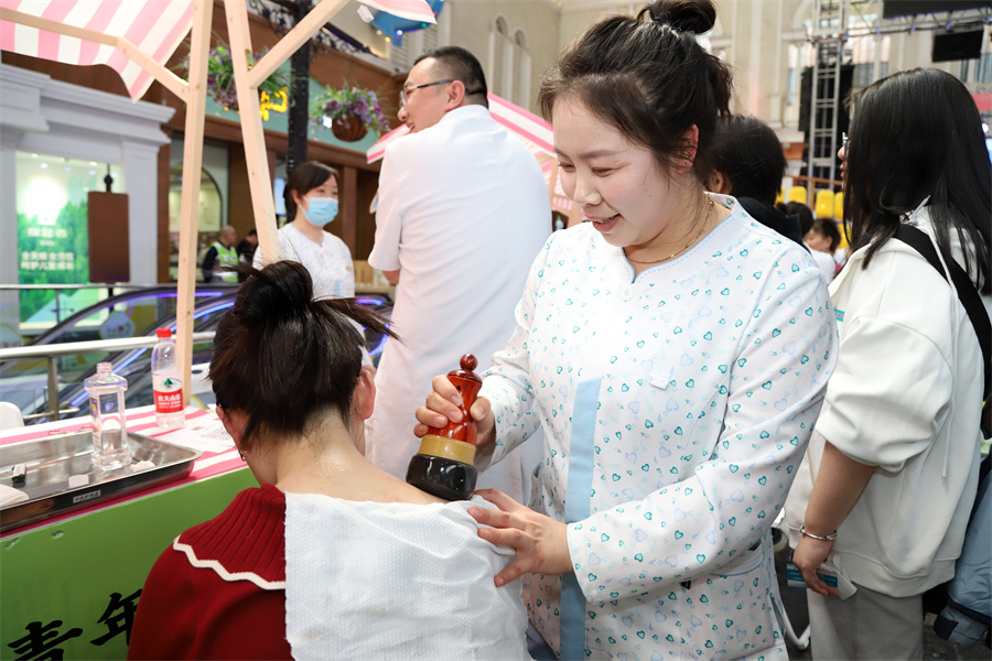 中医药特色疗法体验区无疑成为了市民们争相“打卡”的热门之选。刮痧、拔罐、砭石温灸、揿针、头针、耳穴埋豆……每一项都吸引着市民朋友排队解锁。三天时间里,超3000人参与体验。大家纷纷赞叹这些特色疗法让他们“血脉觉醒”,彻底对中医“着迷”了。