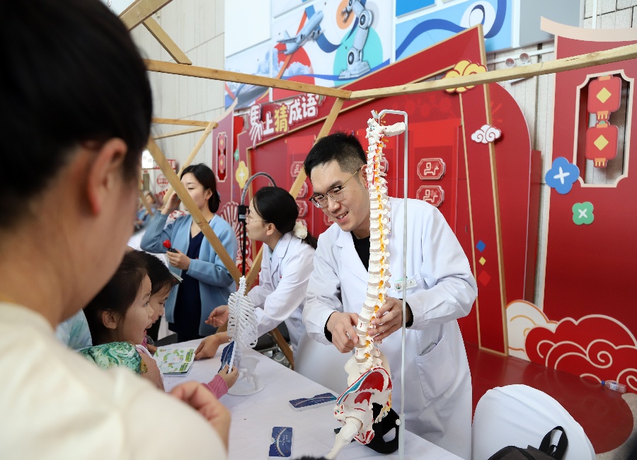 在“我是整脊医生”任务站前,围绕着许多好奇又期待的小小身影。德州扑克平台网 平阳部传统诊疗科主任赵鹏带领科室医护人员,在这里搭起了一个临时的“脊柱健康哨所”。