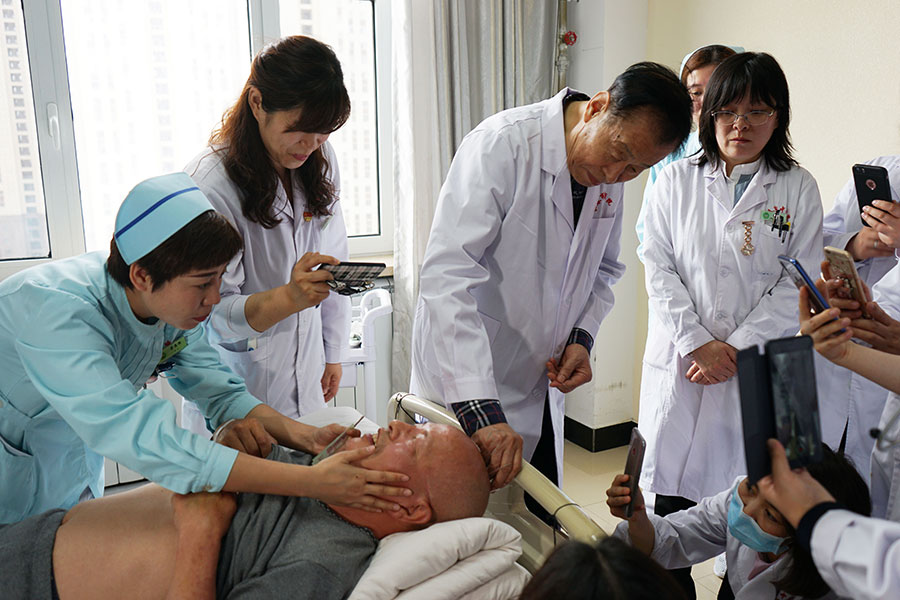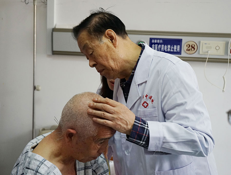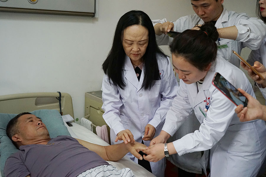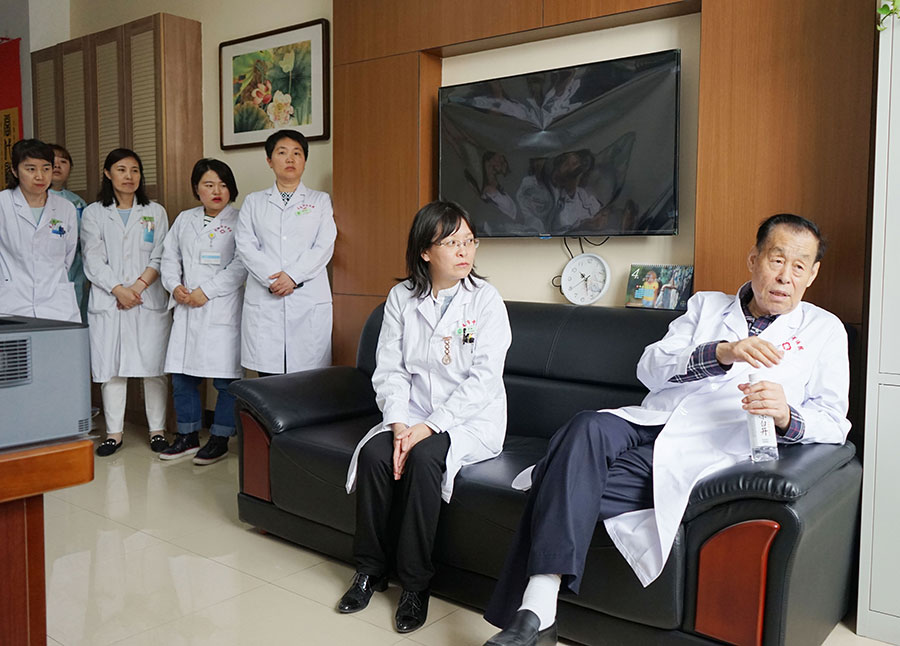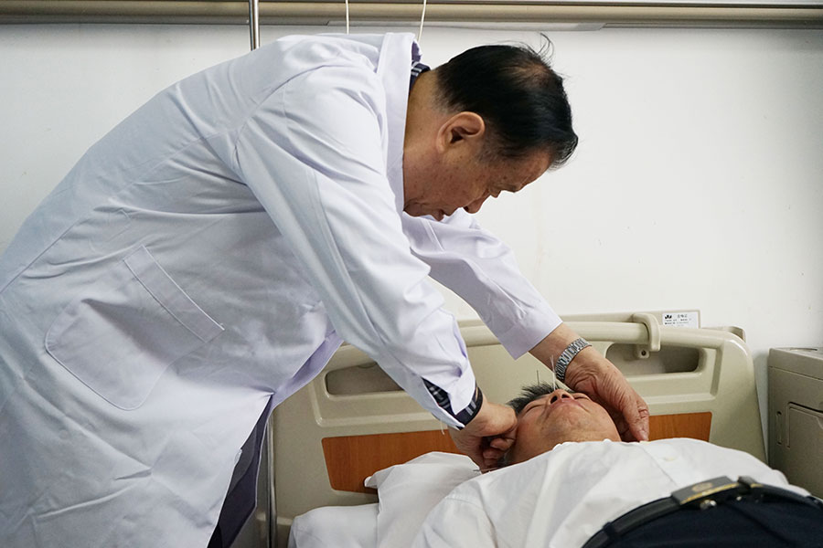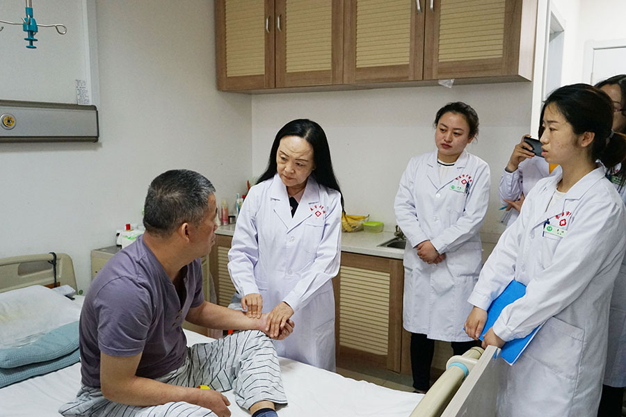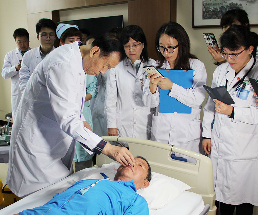 5月13日的教学查房工作是分两组进行的。石学敏院士带领的一组人在脑病科查房。卞金玲教授带领的一组人在总部康复科进行查房。石院士在查房过程中望闻问切、辨证施治,在得知患者病因之后,用通俗易懂的语言,指导患者衣食住行方面的注意事项,并现场为5名患者进行针刺治疗。