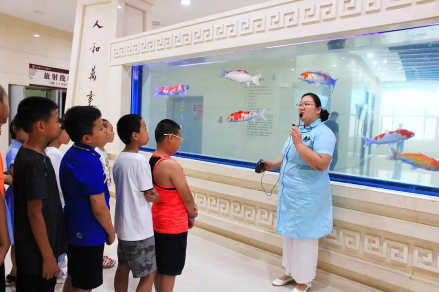 进入门诊大厅,偌大的鱼缸是那样的醒目,里面9条漂亮的锦鲤欢乐地游动。9这个数字在古代被认为是阳数中最大的数字,而水则是至阴之物,这一阴一阳,在鱼儿的游动下交融和合。鱼缸两旁写着“医患鱼水情,人和万事兴。”这也代表德州扑克平台 对医患和合共融的美好期许。