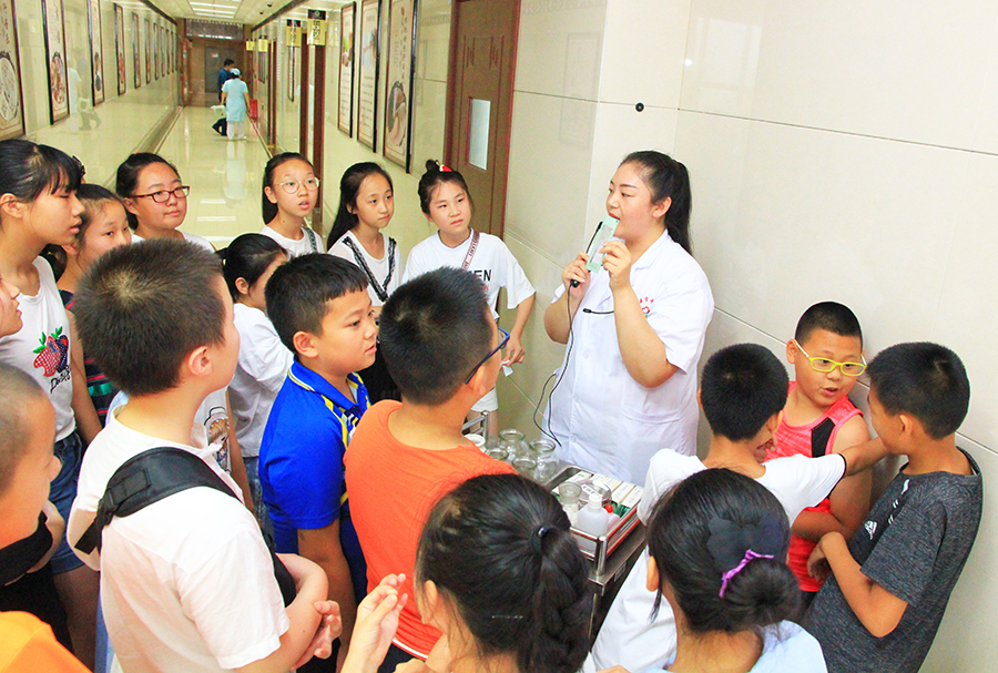 在治未病中心,讲解员现场为同学们讲解治未病理念,分别介绍了中心里面每一个诊室的作用,走到健康宣教区同学们品养生茶,学做手指操,讲解员还为同学们介绍了火罐、能量罐、针灸......让孩子们有些眼花缭乱。