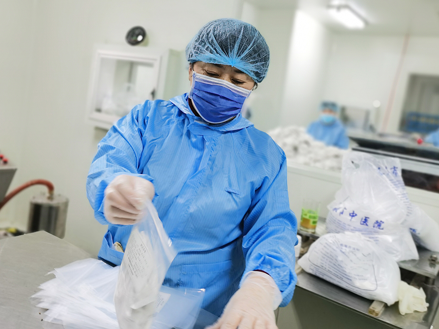 自疫情暴发以来,德州扑克平台网 制剂室主任胡凌歌一直非常忙,从1月22日开始,只在大年三十休息了1天,最近忙得更是12个小时不停歇。在接听小编电话时,她的双手仍在不停地翻飞,将一包包药剂迅速装入包装袋内,她说,这两周,他们要完成60多万袋扶正2号茶剂包装工作,时间紧,任务重,不争分夺秒不行啊。