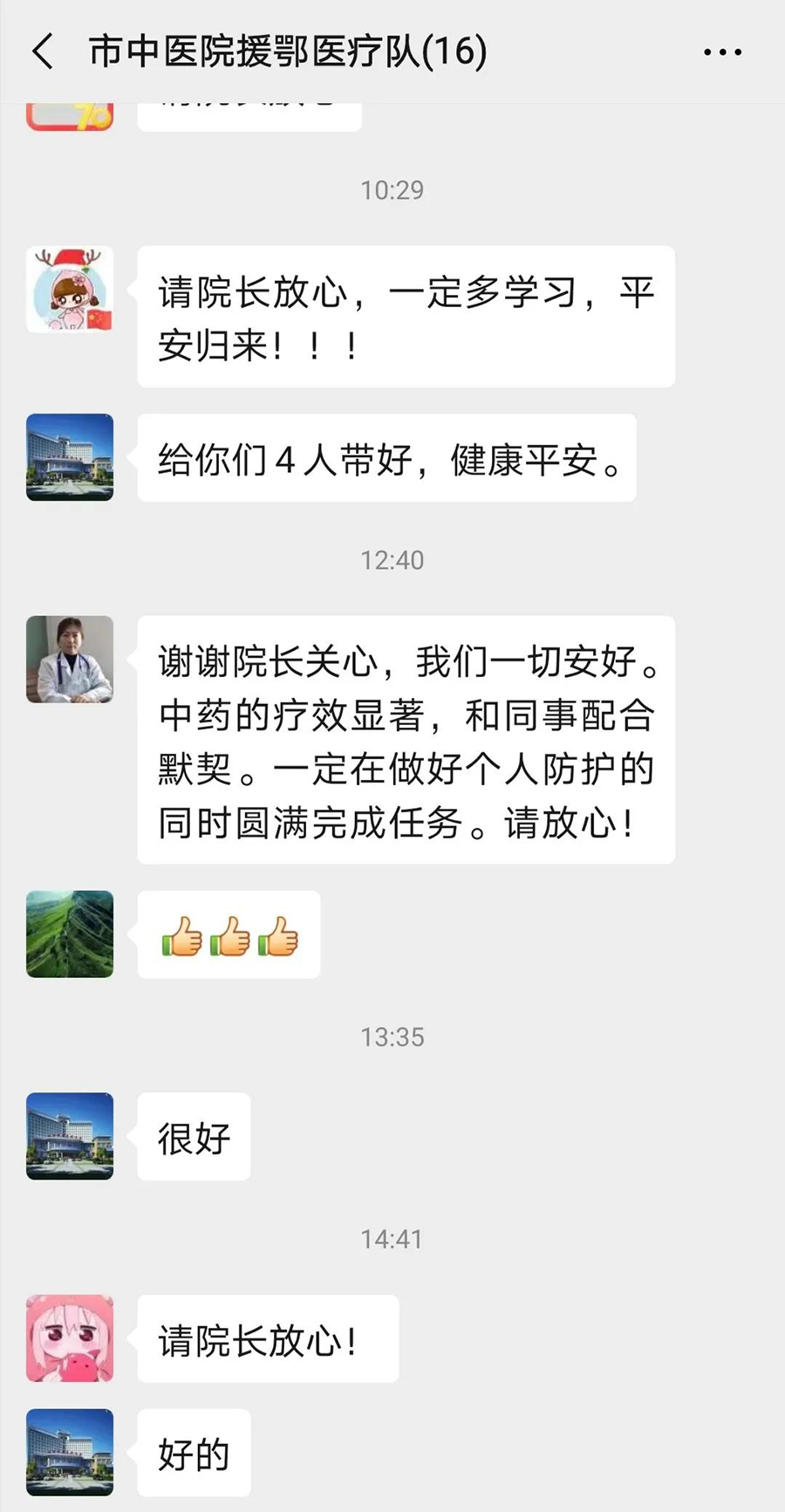 听到院长送来的祝福,身在抗疫前线的战士们心里感到暖暖的。张春玲主任对院长的祝福表示感谢。她说,在这里,大家互相学习、共同切磋,有心得、有收获,让领导放心,他们有信心、有能力将工作做好。张春玲主任还向院长汇报了中医中药疗法的介入所取得的显著效果,当孙良金院长听说疗效得到患者的高度认可,也赢得了西医同道的赞誉时很欣慰。重症医学科主治医师潘英伟也表示,他们一定多思考、多学习、多总结,不辱使命,平安归来。平阳部肺病科王丽娜,重症医学科李延吉、张丽博,总部心病科吴晗,总部肺病科王佳也纷纷回应让院长放心。