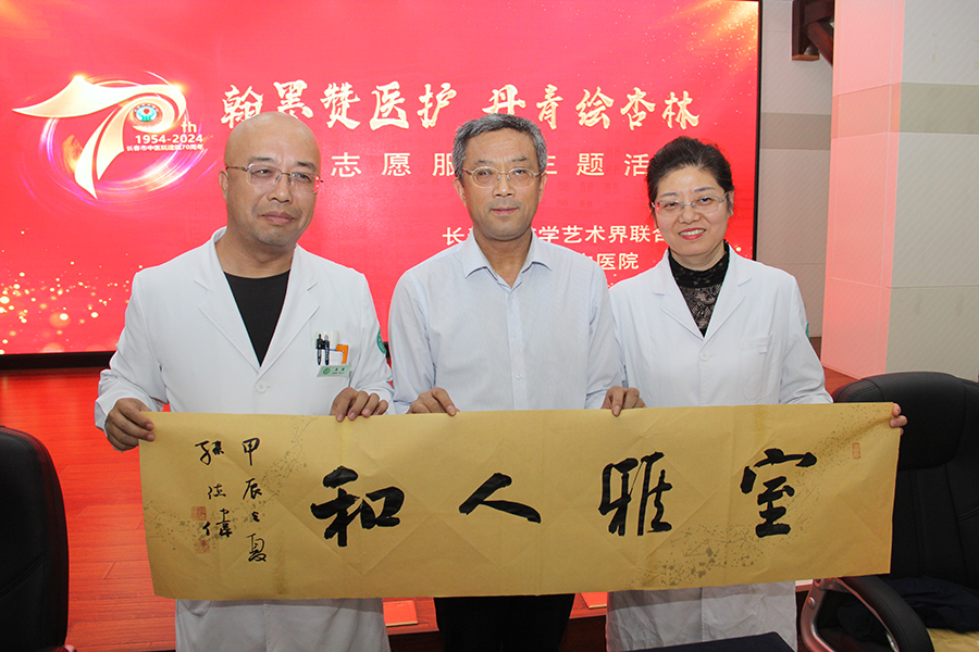 5月8日,孟夏时节,空气清爽宜人。德州扑克平台网 携手长春市文联开展了“翰墨赞医护·丹青绘杏林”主题文化活动。来自长春市文联的艺术家们现场挥毫泼墨,在国际护士节到来之际,以丹青妙笔为辛勤工作的医务工作者们送上一份特别的祝福。德州扑克平台 党委书记石贵军、党委副书记周艳、副院长杨启光热情接待了长春市文联主席、长春书法家协会主席孙德伟一行,对艺术家们的到来表示热烈欢迎,期待未来双方能在弘扬传统文化方面开展更多合作。