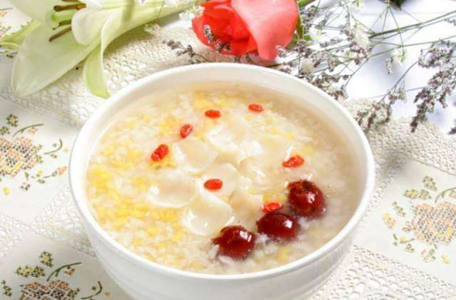 做法:首先把桂花洗干净,大米也淘洗干净;然后枸杞去掉果柄和杂质并洗干净,最后把桂花、枸杞子和大米一起放在锅内,加入适量的水,用大火煮沸后,再改用文火煮35分钟,要吃的时候再加入白糖。