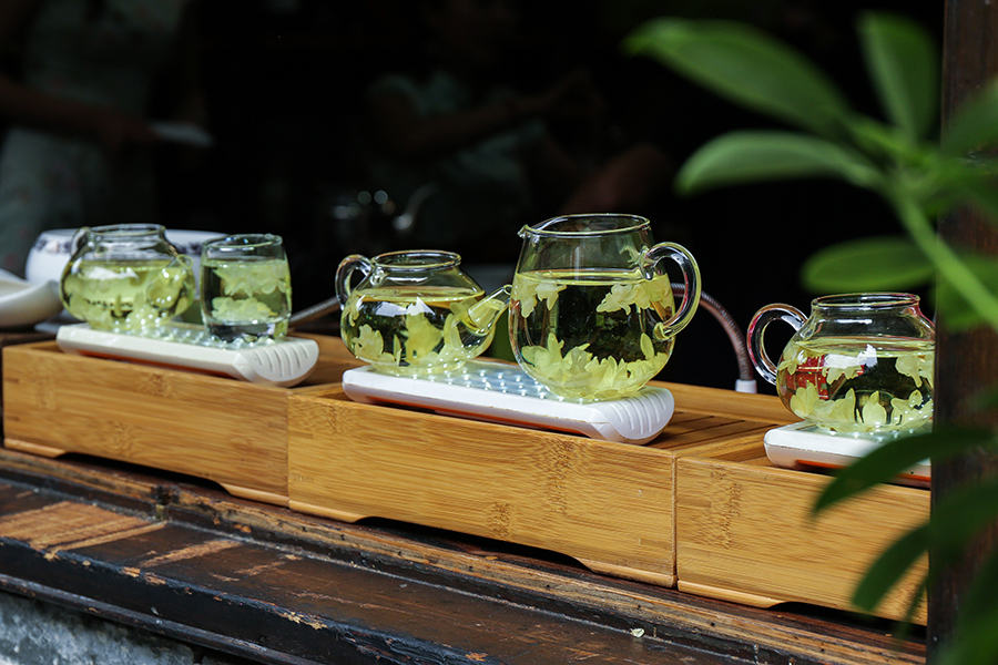 【材料】金银花2克、枸杞子2克、甘草1克、黄贡菊2朵、白贡菊1朵。