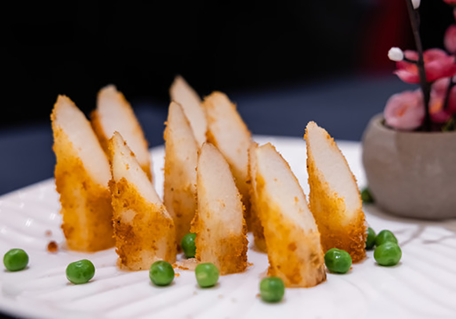 【做法】山药洗净,上锅蒸熟,取出后去皮,切1寸长段,再一剖两片,用刀拍扁。锅烧热倒入植物油,等油烧至七成热时,投入山药,炸至发黄时捞出待用。另烧热锅,放入炸好的山药,加糖和水两勺,文火烧5~6分钟后,即转武火,加醋、味精,淀粉勾芡,淋上香油,起锅装盘即成。