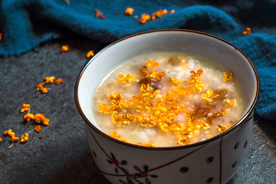 材料:桂花、枸杞各10克,大米100克,白糖15克。