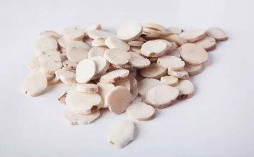 饮片白芍:呈类圆形的薄片。表面淡棕红色或类白色、平滑。切面类白色或微带棕红色,形成层明显,可见稍隆起的筋脉纹呈放射状排列。气微,味微苦、酸。